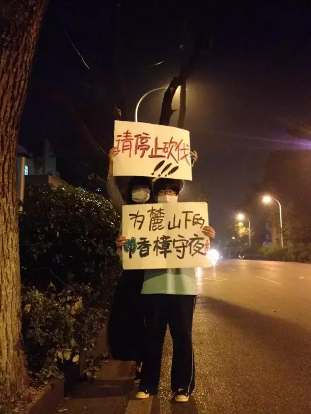 今夜,我们真该为这些大树做些什么,至少可以陪在这些大树的身边,让她们感觉并不孤单。@绿色潇湘 官方微博发起#我为香樟守夜#活动,邀请有空的路过的志愿者们来记录香樟被移栽的过程。